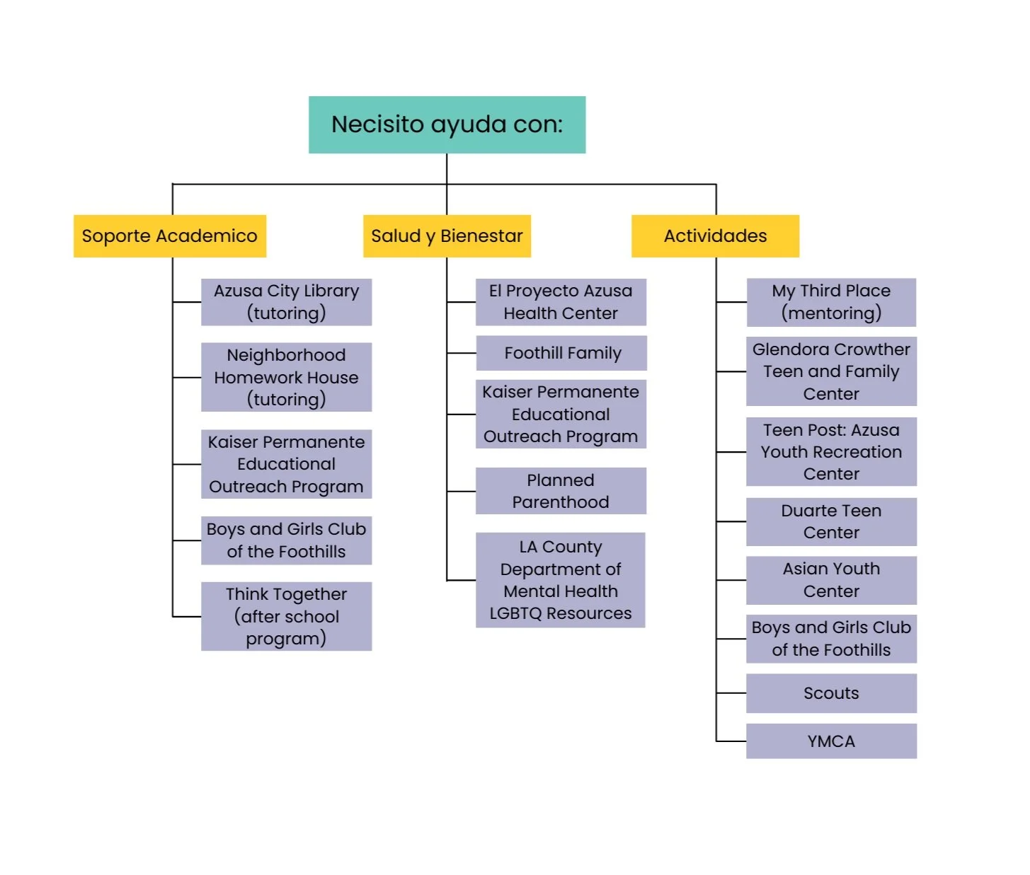 Si está buscando recursos para adolescentes incluyendo apoyo académico, salud y bienestar, o oportunidades recreativas, ha llegado al lugar correcto. El guía y video abajo va ayudar a conectar personas a organizaciones apropiadas para satisfacer sus necesidades. Para información y descripciones de los servicios se encuentra en la parte baja de esta página. Si necesita asistencia en persona, contacte a la librería de Azusa con el departamento de conexiones vecinales al (626) 812-5100.