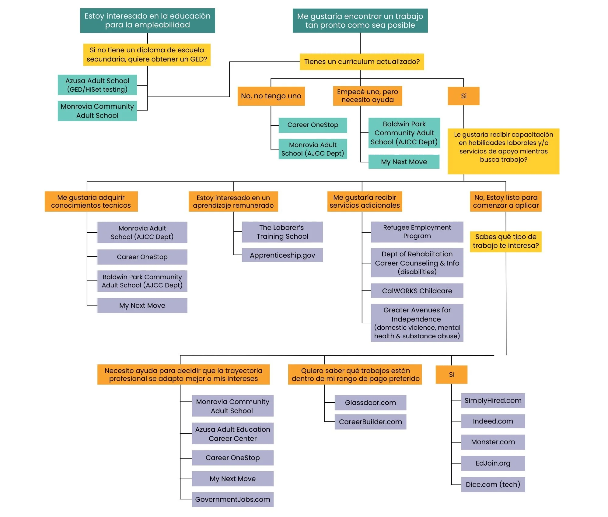 Si está buscando asistencia y consiguiendo empleo, este lugar es para ti, no importa donde estés al momento en tu esfuerzo de encontrar trabajo. El camino abajo te conecta a recursos en cómo lograr completar clases por medio de Desarrollo Educacional General (GED), completar resume, clases de entrenamiento para trabajo, y asistencia en buscar un trabajo. El programa de Love Azusa se apura que tenga acceso y apoyo en mejorar su bienestar y ayudarte a prosperar. Para información de contacto y descripción en detalle de los servicios, por favor baje hasta la última parte de esta página. Si necesita asistencia en persona, contacte a la librería de Azusa con el departamento de conexiones vecinales al (626) 812-5100.