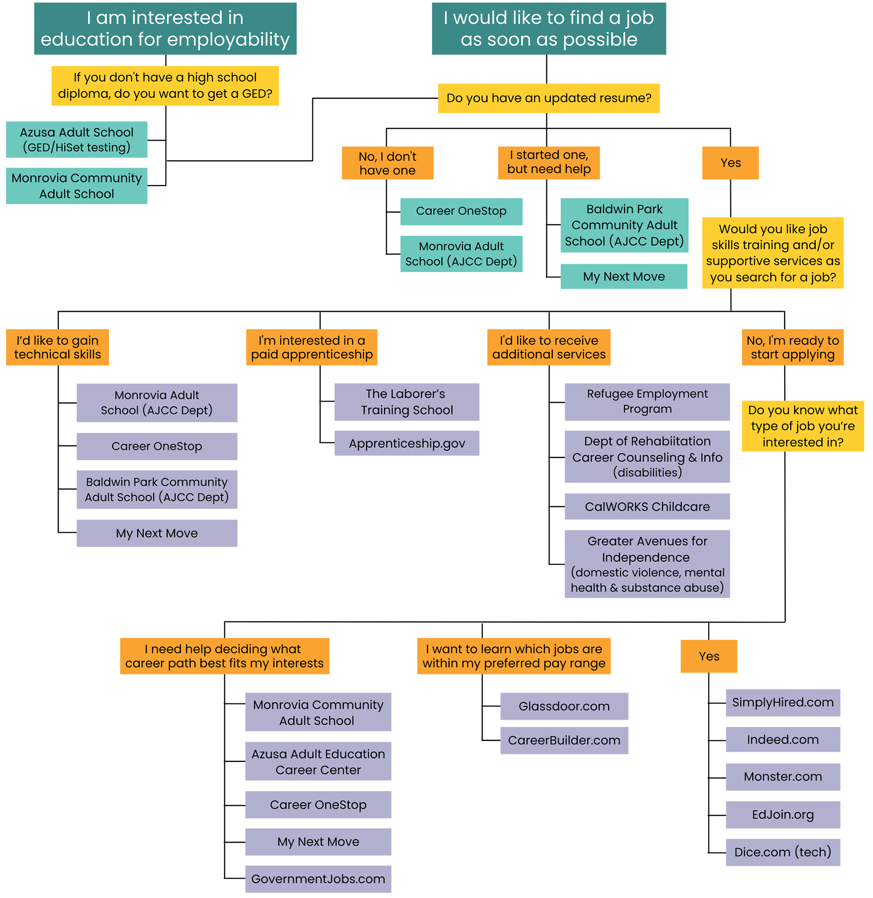 If you are looking for employment assistance, this is the place for you – no matter where you’re at in the job search process. The pathway below will connect you to resources like GED classes, resume building, job training classes, and job search assistance. Love Azusa cares about your access to support that will improve your well-being and help you thrive. For contact information and detailed descriptions of resources, scroll down to the bottom of this page. If you need in-person assistance, contact Azusa Library’s Neighborhood Connections at (626) 812-5100.